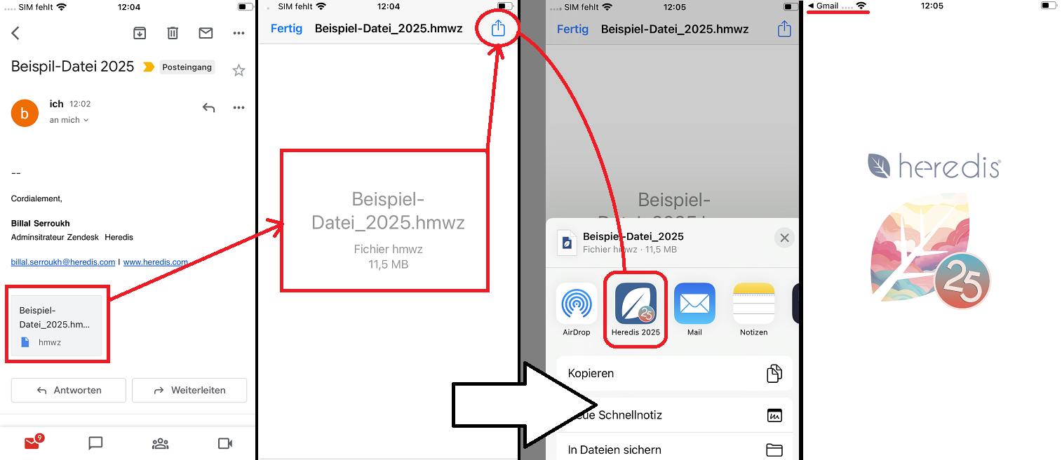 Laden Sie auf dem iOS-Gerät, auf dem Sie die Stammbaumdatei empfangen möchten, die komprimierte Datei im Format .hmwz aus der E-Mail herunter, die Sie sich selbst geschickt haben, und wählen Sie Heredis 2024, um sie zu öffnen.