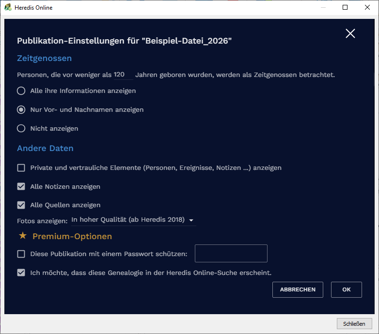 „Veröffentlichen”, um Ihre Datei auf Heredis Online zu veröffentlichen.