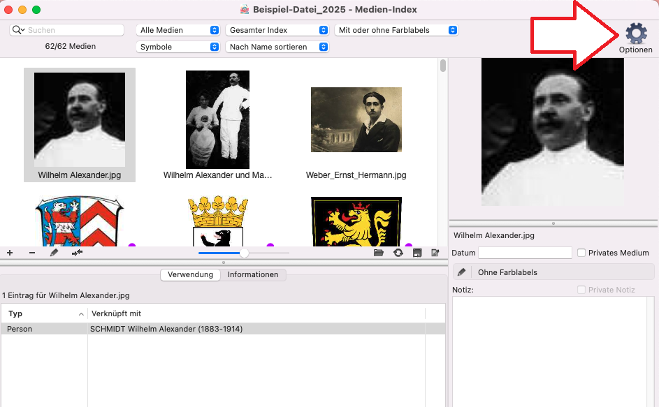 Öffnen Sie Ihre Genealogiedatei und gehen Sie zum Medien-Index. Klicken Sie auf das Zahnrad: