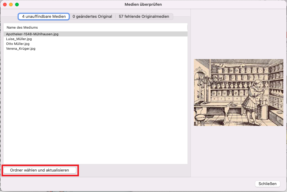 Die Heredis-Software enthält ein Werkzeug, mit dem Sie Ihre Medien mit den Originalen verknüpfen können, wenn Sie sie verschoben, umbenannt oder den Computer gewechselt haben.