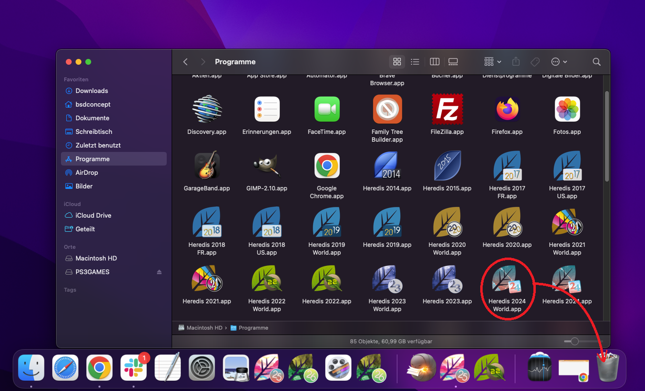 Um die Heredis-Software zu entfernen, gehen Sie zum Ordner „Anwendungen” in Ihrem Finder und ziehen Sie das Symbol der Softwareversion, die Sie deinstallieren möchten, in den Papierkorb: