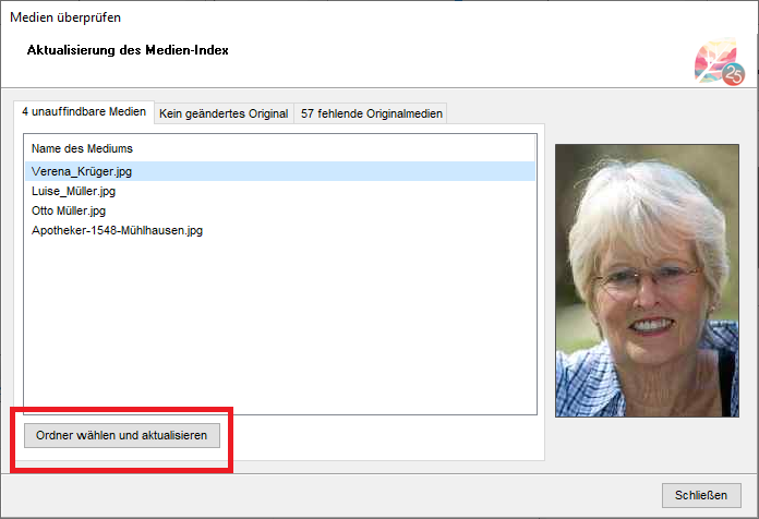 Die Heredis-Software enthält ein Werkzeug, mit dem Sie Ihre Medien mit den Originalen verknüpfen können, wenn Sie sie verschoben, umbenannt oder den Computer gewechselt haben.