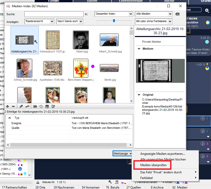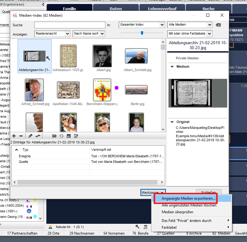 Die Heredis-Software verwaltet Medien auf zwei Ebenen: Originale und Kopien.