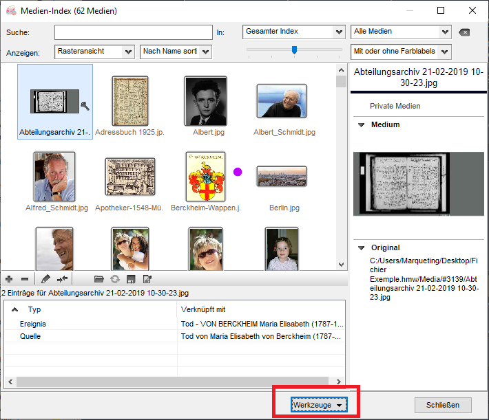 Öffnen Sie Ihre Genealogiedatei und gehen Sie zum Medien-Index. Klicken Sie auf Werkzeuge: