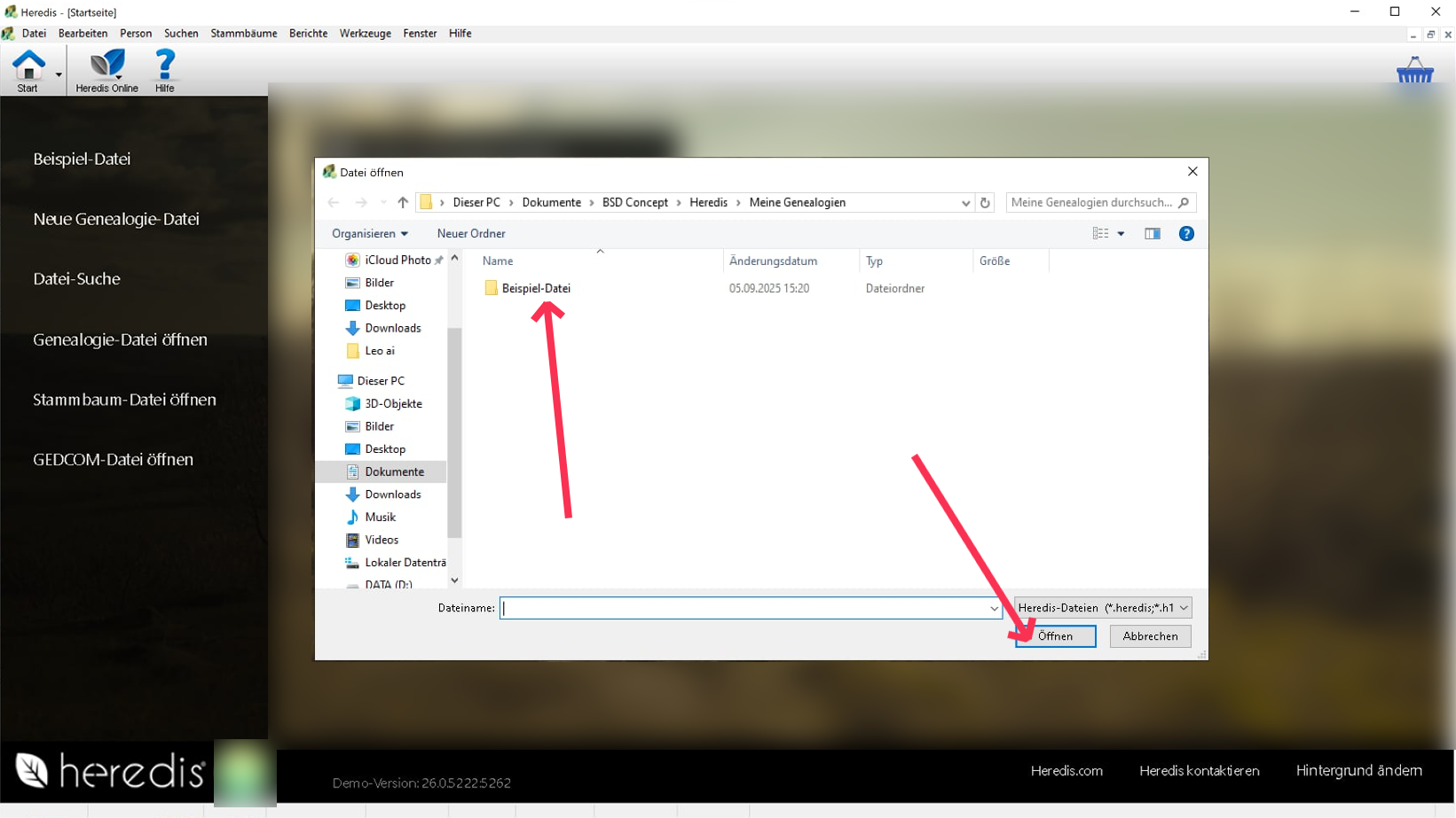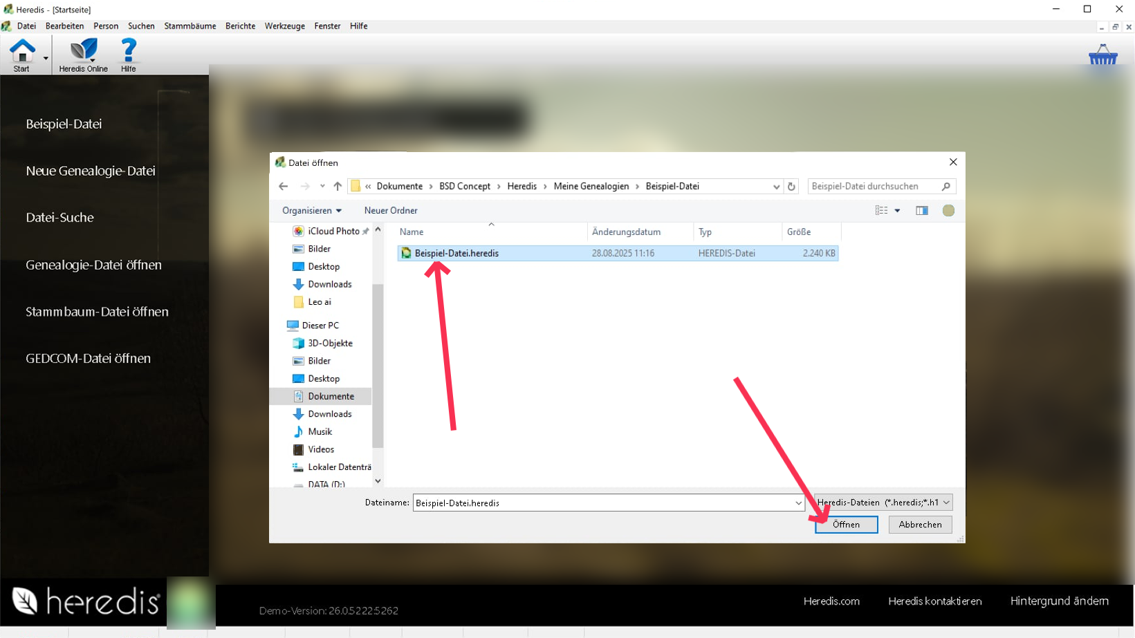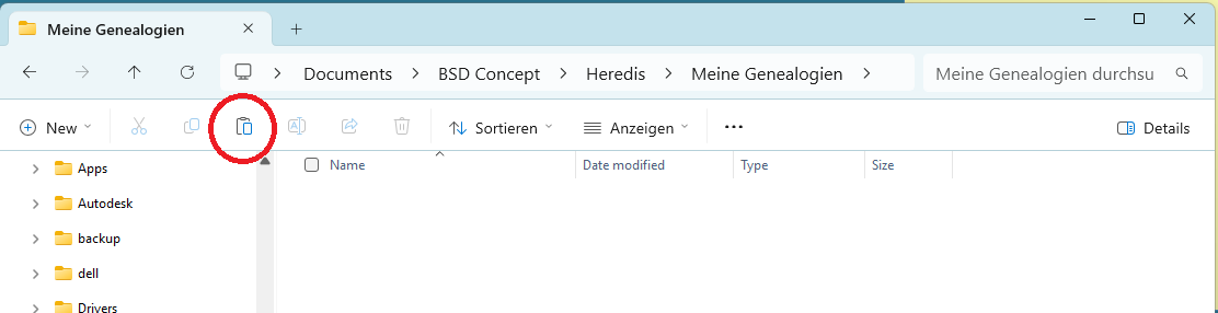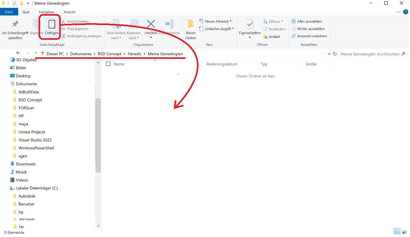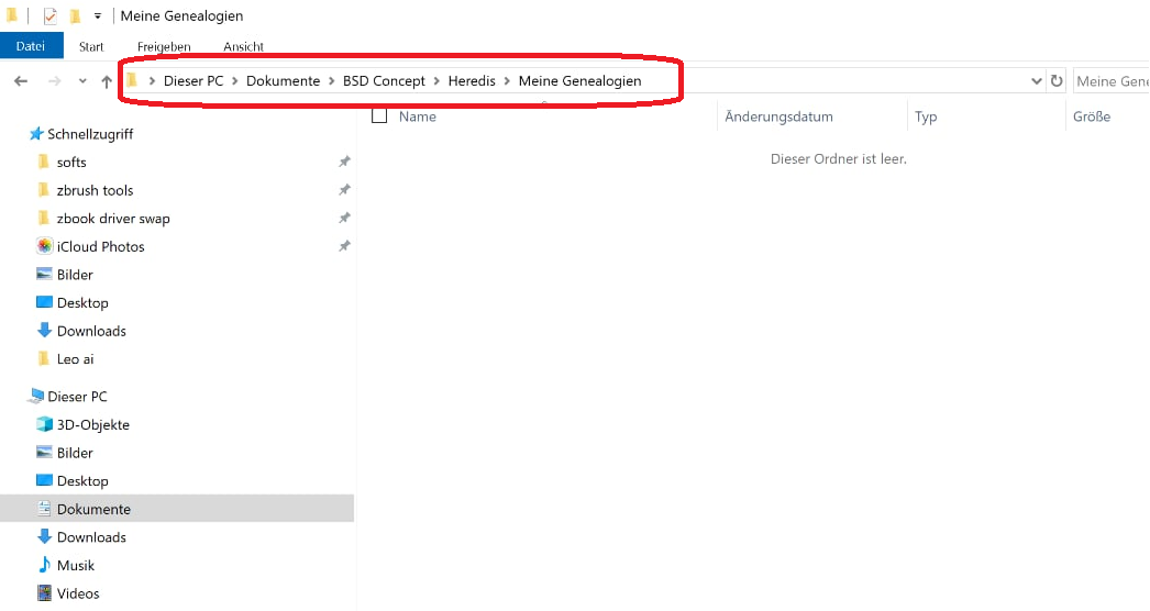 Wenn die Datei an einem anderen Ort als Dokumente -> BSD Concept -> Heredis -> Heredis Dateien gespeichert ist, müssen Sie sie an diesen Ort verschieben.