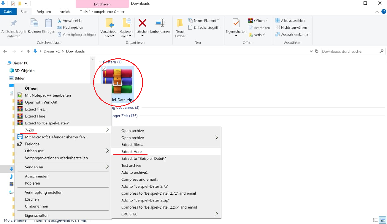 (Die Option zum Entpacken kann bei anderen Archivierungsprogrammen leicht abweichen.)