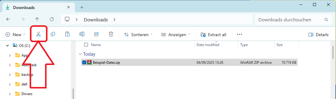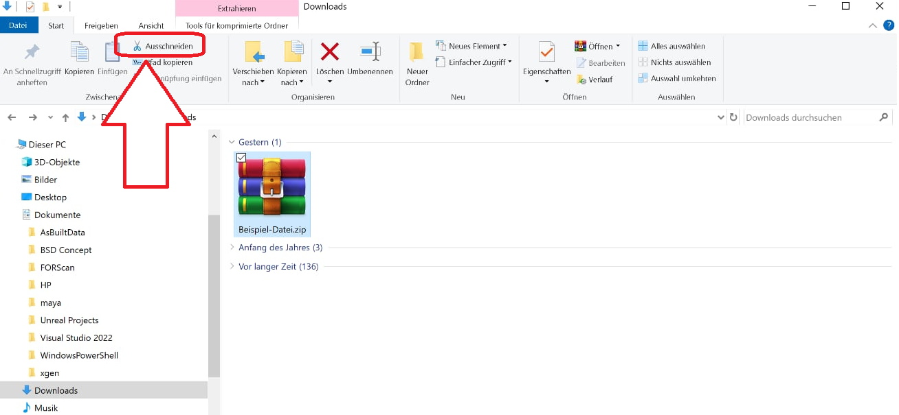Gehen Sie zu dem Ort, an dem die Datei gespeichert ist (hier ist es der Standardordner Downloads), wählen Sie die Datei aus und klicken Sie auf "Ausschneiden":