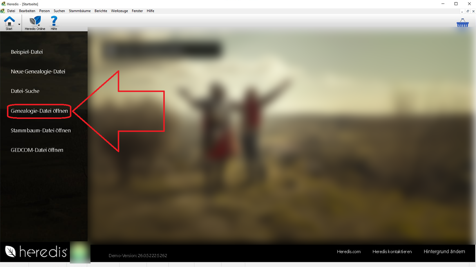 Öffnen Sie die Heredis-Software. Klicken Sie auf der Startseite auf "Genealogies-Datei öffnen":