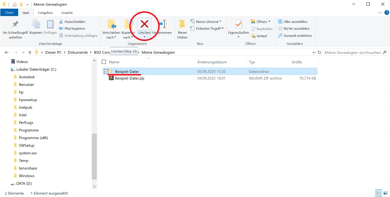 Um die alte Datei vollständig vom Computer zu löschen, gehen Sie zu Dokumente -> BSD-Konzept -> Heredis -> Heredis-Dateien auf Ihrem Computer, klicken Sie mit der rechten Maustaste auf den Ordner und wählen Sie "Löschen":