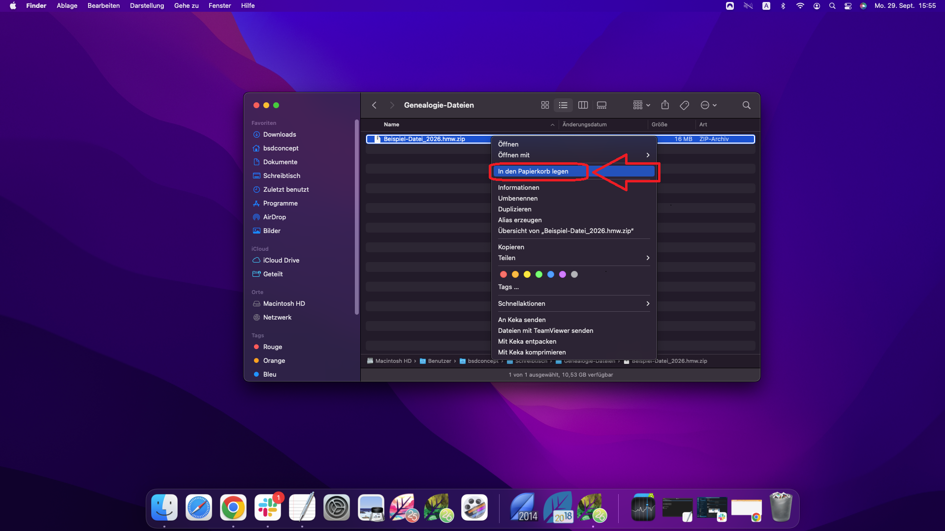 Um die alte Datei vollständig vom Computer zu löschen, gehen Sie zum Speicherort der Genealogie auf Ihrem Computer, klicken Sie mit der rechten Maustaste auf den Ordner und wählen Sie „In den Papierkorb legen”