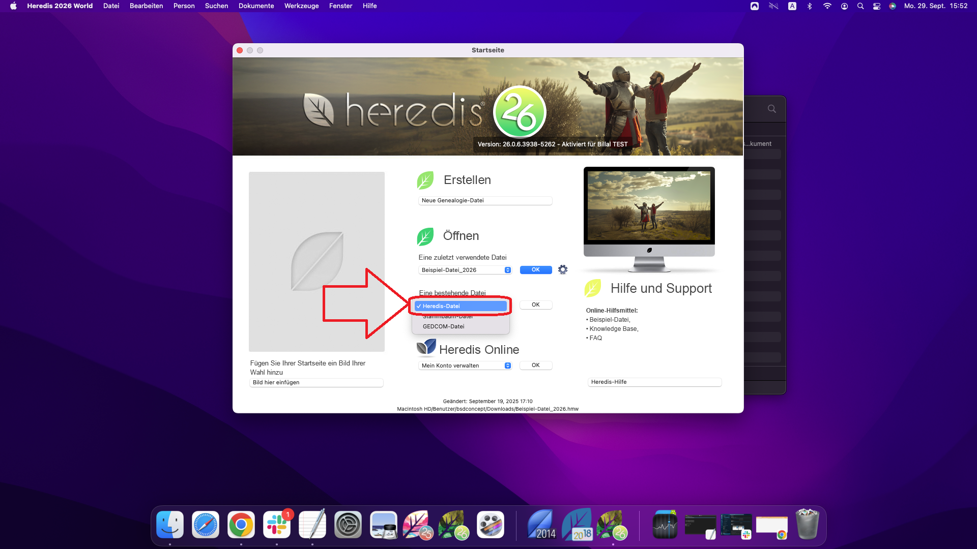 Öffnen Sie die Software Heredis. Klicken Sie auf der Startseite auf „Öffnen“ -> „Heredis-Datei“ -> „OK“: