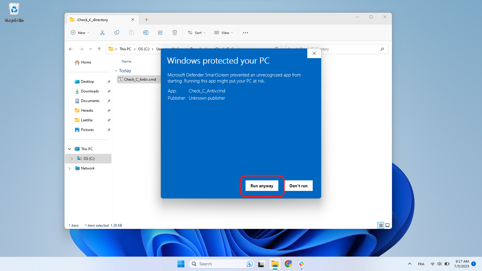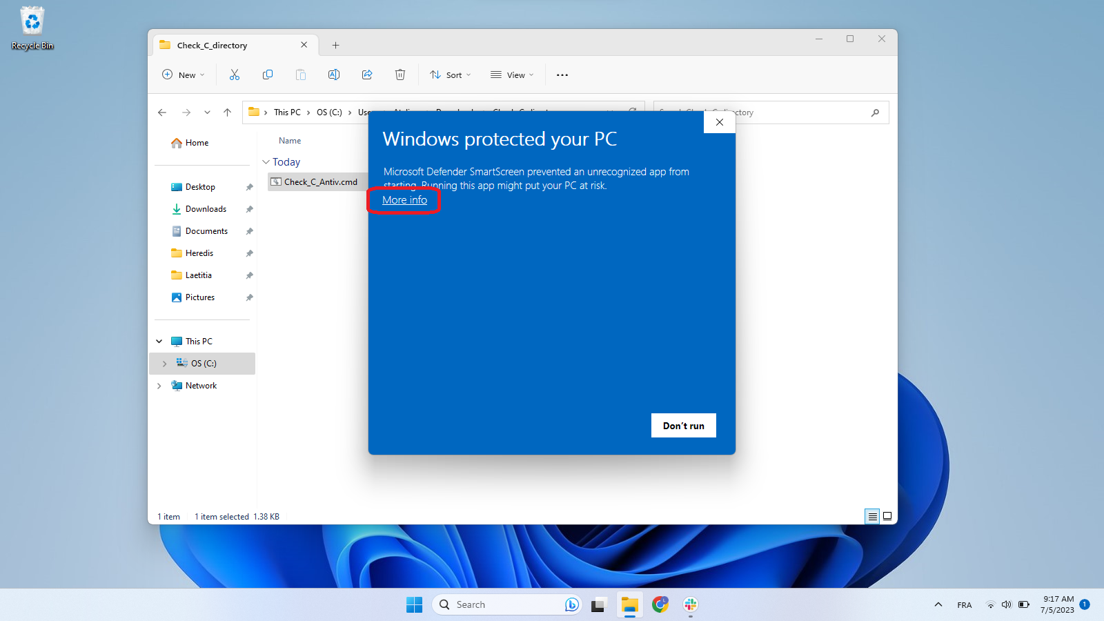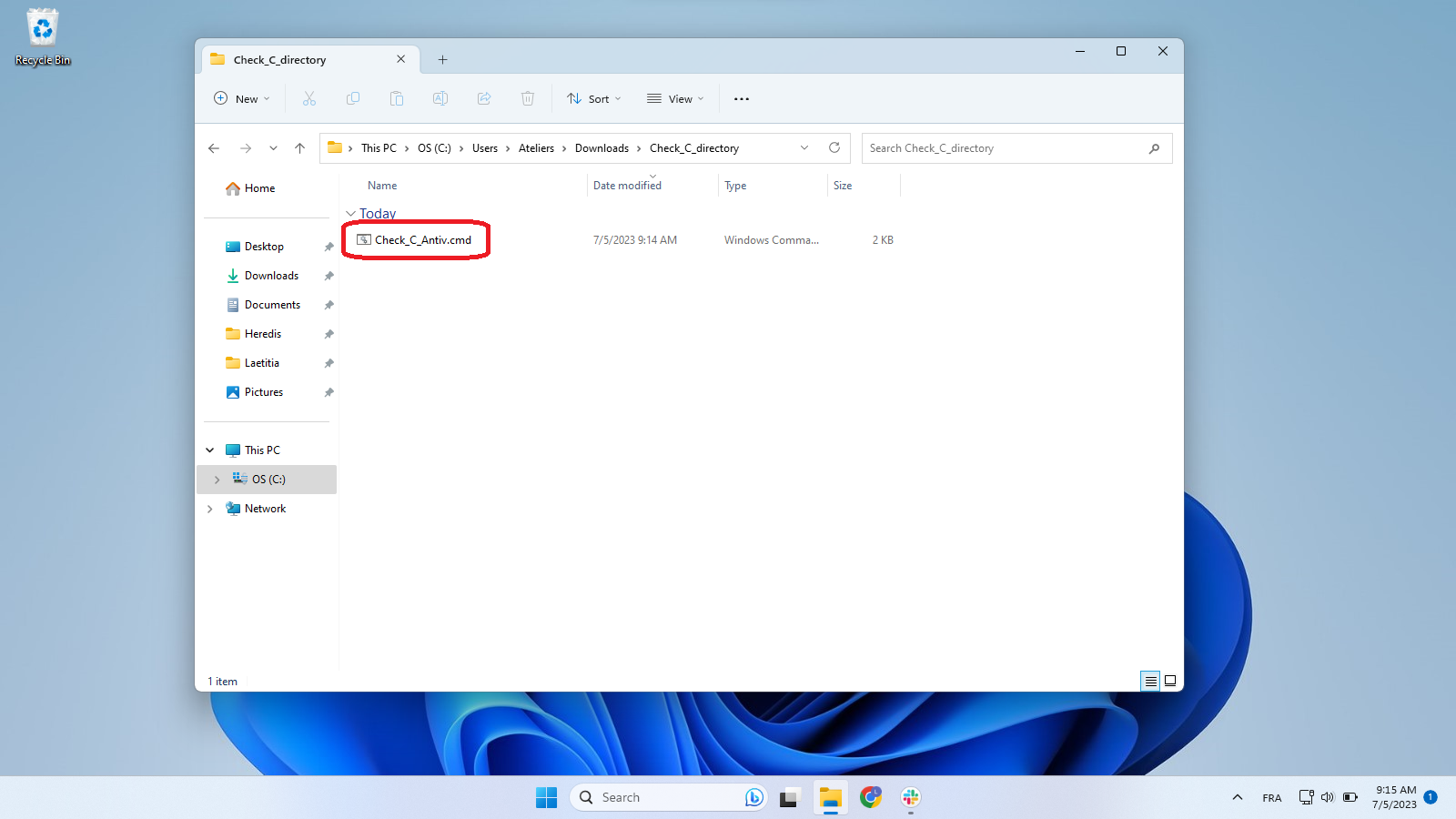 Open the folder named "Check_C_directory" and double-click on the file Check_C_Antiv.cmd :