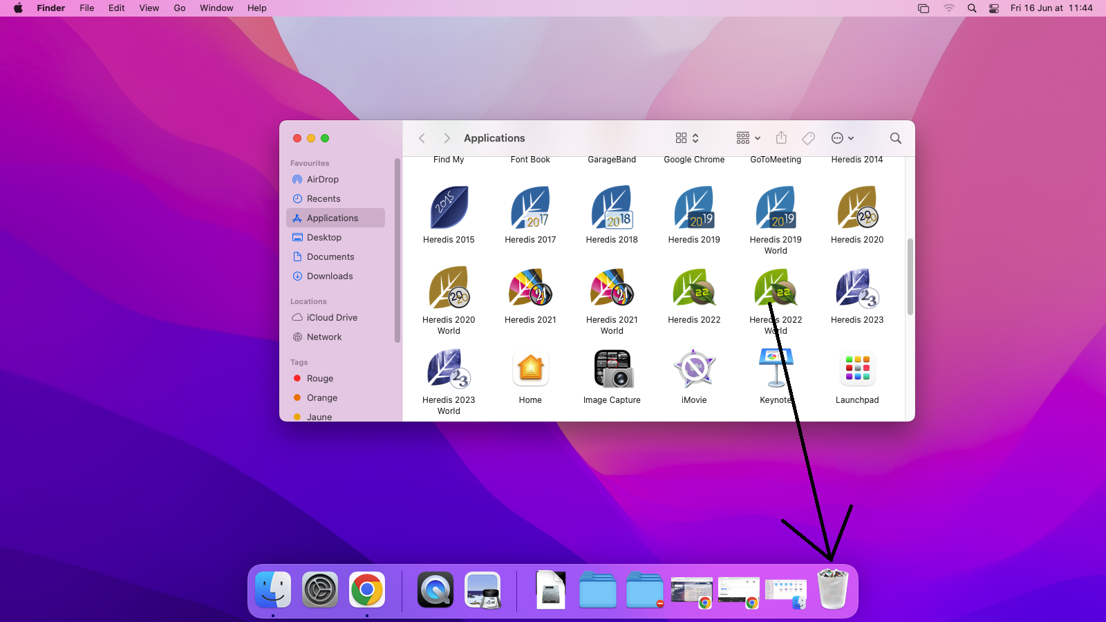 To remove the Heredis software, go to the Applications folder in your Finder and drag the icon of the software version you want to uninstall into the Bin: