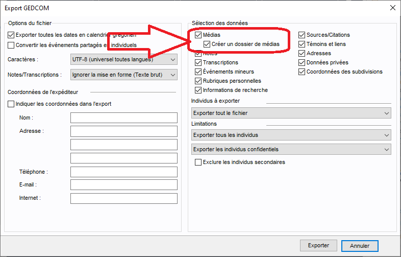 IMPORTANT : Si vous transmettez le fichier GEDCOM à une autre personne, pensez à lui donner aussi le dossier de médias.