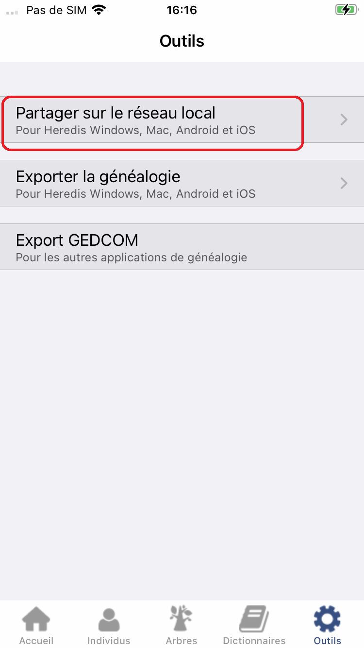 Sur l'appareil qui envoie le fichier, ouvrez l'application Heredis, ouvrez votre fichier de généalogie. Sélectionnez la roue Outils, puis Partager sur le réseau local :