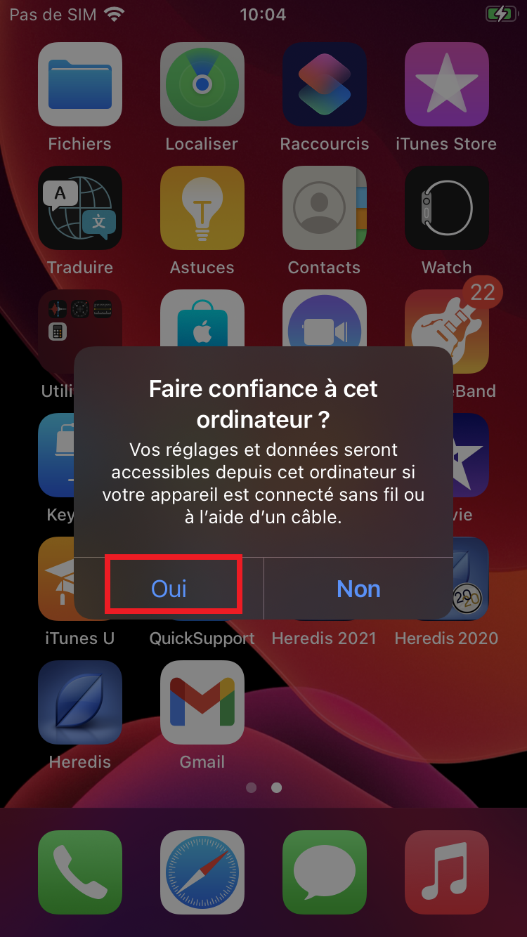 Branchez l'appareil mobile à l'ordinateur via son câble USB. Si le mobile vous demande si vous faites confiance à cet ordinateur, sélectionnez Oui: