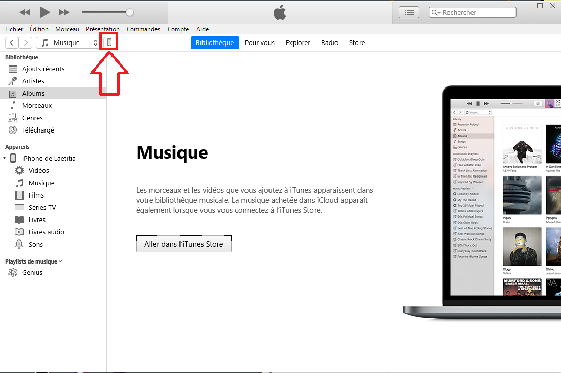 Dans l'application iTunes de votre ordinateur, cliquez sur l'icone de l'appareil iOS :