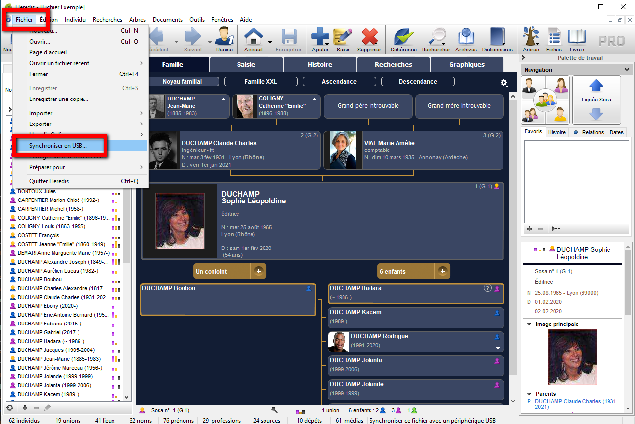 Branchez la clé USB sur votre ordinateur, puis ouvrez le logiciel Heredis et ouvrez votre fichier de généalogie.