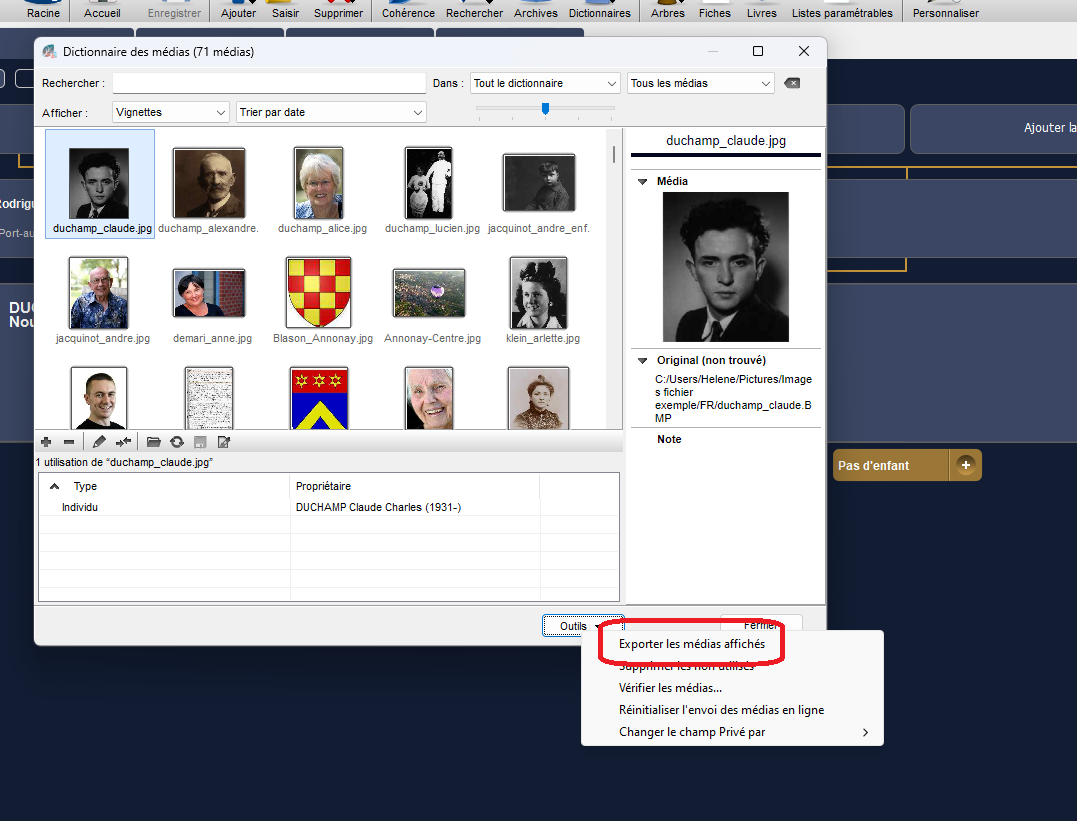 Si les originaux ne sont plus dans votre ordinateur, mais que les copies sont toujours présentes dans le dossier de généalogie au format Heredis, vous pouvez exporter les copies dans un répertoire unique depuis le dictionnaire des médias :